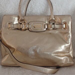 Chic Michael Kors satchel in metallic gold. Features elegant handles and a sleek design. Perfect for elevating any outfit.