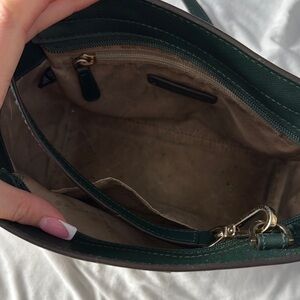 Elegant Michael Kors bag with signature monogram. Features gold-tone logo and green strap.