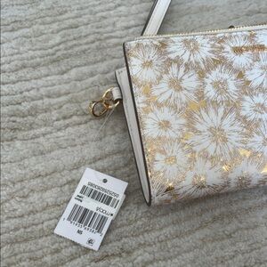 Chic wristlet with gold floral pattern. Stylish and versatile accessory.