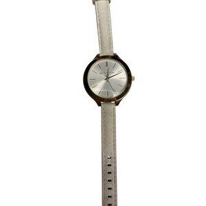 Features a gold-tone stainless steel case with a minimalist silver dial and slim hour markers. Comes with original genuine white leather strap and buckle clasp marked “Michael Kors.”