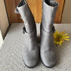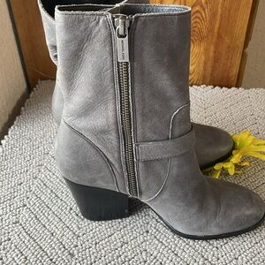 Micheal Kors Ashton gray leather zippered block heel booties strap detail.