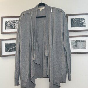 Michael Kors open front cardigan in soft heather gray. Features draped lapels, ribbed trim, and zipper accents on the shoulders for a modern touch. Lightweight knit fabric with a relaxed fit, perfect for layering.