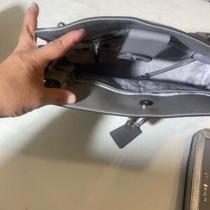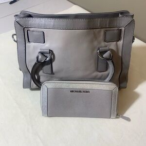 Chic Michael Kors satchel with matching wallet. Stylish gray tones. Perfect for any occasion.