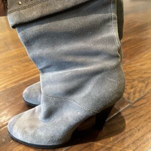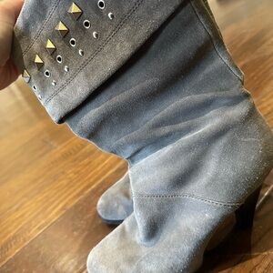 Elegant gray suede boots with studded accents. Perfect for adding flair to any outfit.