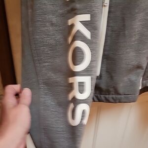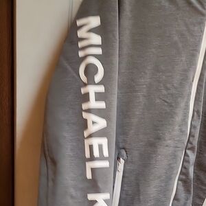 Chic gray windbreaker by Michael Kors. Features bold logo on sleeve. Lightweight and stylish. Size large PTP 24.