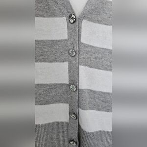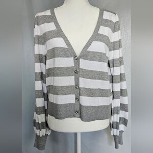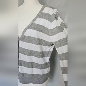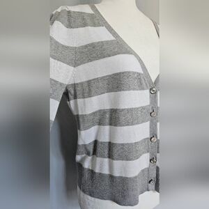 Chic striped cardigan with button front. Soft and comfortable. Ideal for layering.