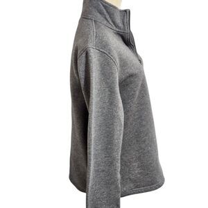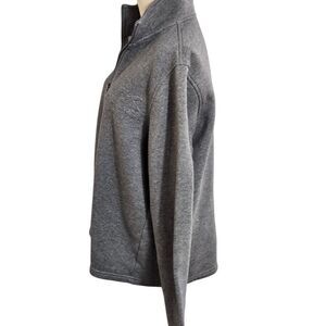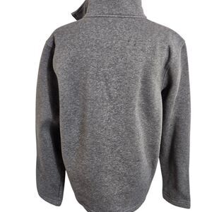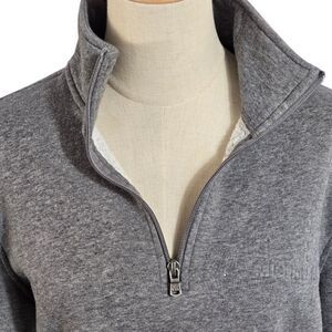 Logo is embossed in the material..simple gray quarter zip for layering. Soft inside. Good overall condition