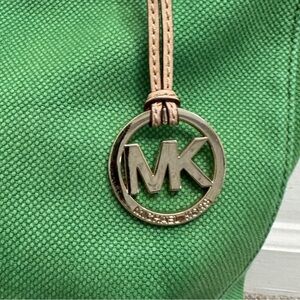 Classic and versatile Michael Kors tote bag in a vibrant green canvas with tan leather straps and gold-tone hardware. Features the signature MK medallion charm. Spacious interior makes it perfect for everyday use, work, or travel. Timeless style with sturdy construction.