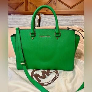 This Michael Kors satchel in a striking green hue is crafted from durable saffiano leather, featuring elegant gold-tone hardware. Its structured design includes top handles and an adjustable shoulder strap, making it a versatile accessory for any occasion.