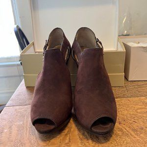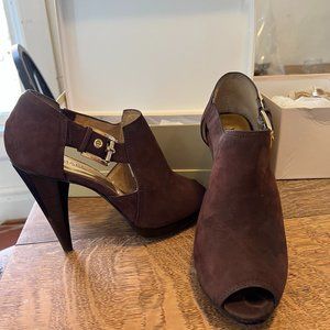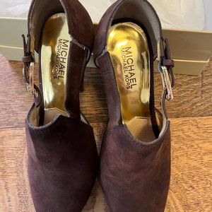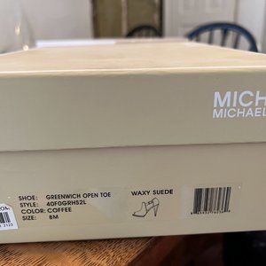 Michael Kors Greenwich Open Toe heels. They're Coffee color waxy suede with gold buckles. They no longer fit, but I always got a ton of compliments! They are in great shape.
