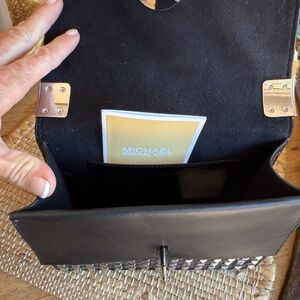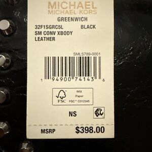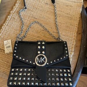 The Michael Michael Kors Greenwich SM Convertible Crossbody is the perfect blend of edgy and elegant. Crafted from luxe black leather with silver-tone pyramid studs, chain strap, and the signature MK turn-lock detail, it transitions effortlessly from day to night.