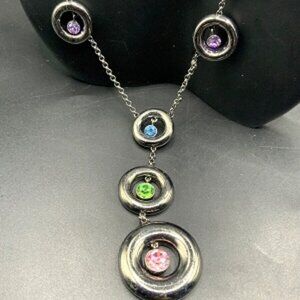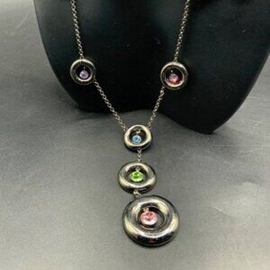 This stunning Michael Kors modern circle station "Y" necklace features a series of elegant pendants in a variety of rhinestone colors (Pink, Green, Blue, Purple) on a gunmetal grey chain. A chic and colorful accessory, Perfect for layering or as a bold statement piece. Perfect for adding a touch of sophistication to any outfit.
