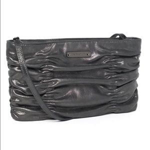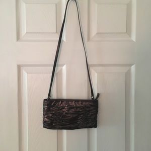 Webster rouched gunmetal metallic leather wallet clutch that can also be converted to a shoulder bag. Shoulder strap has snaps and is detachable; 6 credit card slots, 1 zipper pocket, & 1 multi-function pocket; Approx. 5" H x 9.5" W x .75" D; 35" strap (17" drop)
