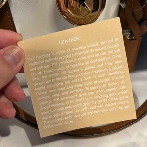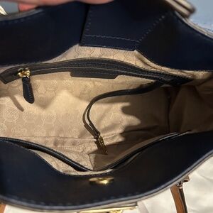 Unique Hamilton leather satchel with detachable crossbody strap for different styling options. Navy and white colorblock design with signature Michael Kors lock and key embellishments. Multiple interior pockets (1 zipper) and snap top closure.