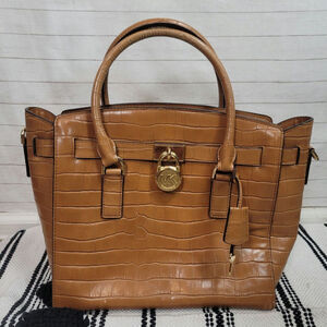 Michael Kors Hamilton Embossed-Leather Satchel in Acorn