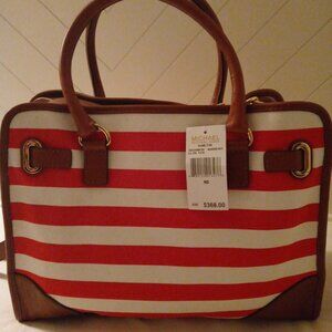 Stylish Michael Kors Hamilton Large Striped Canvas Tote - Style # 38S4XHMT9R. Mandarin and white striped canvas exterior accented with gold tone hardware, magnetic snap enclosure and leather trim/handles/strap. Monogramed interior lining with 4 slip pockets,1 large zip pocket and padded middle divider zip compartment. Care card included. This bag is perfect if you want something that is very elegant, durable, and functional.