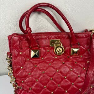 Michael Kors Hamilton Large Studded North South Tote Red Leather Gold Hardware