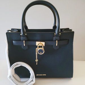 Michael Kors Hamilton Medium Satchel Crossbody Handbag Navy Leather