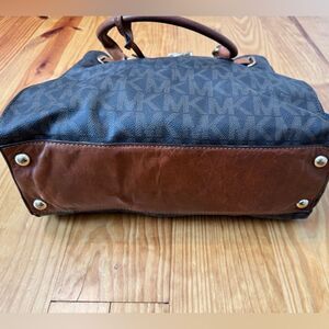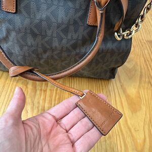 This is a Michael Kors Hamilton satchel purse in a medium size with a brown leather exterior featuring the signature monogram logo. It has gold hardware, a magnetic closure, and double brown leather handles. The bag includes a detachable strap, bottom studs, and a bag charm. The interior has beige leather lining with inner pockets. It also has a gold chain strap detail and showcases the Michael Kors signature style.