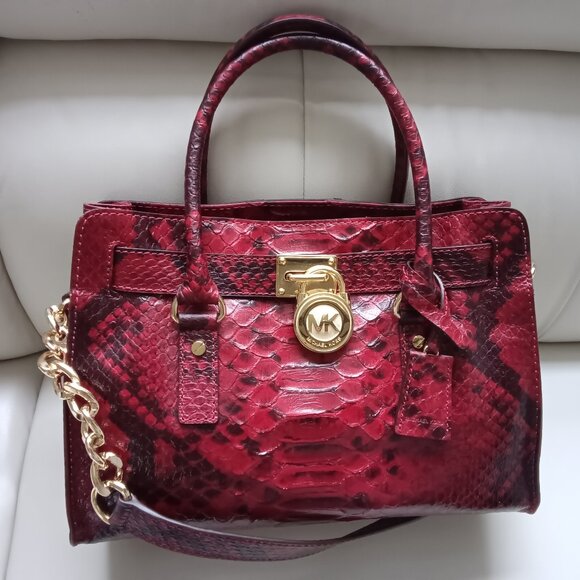 Michael Kors East-West Hamilton Medium Convertible Snake Python-Embossed Red Leather Satchel Double handles and longer attached chain/leather shoulder strap Exterior features GOLD-tone hardware including lock Interior features 1 zip pocket, 2 open pockets, 1 cellphone pocket, and key clip so you never lose your keys.
