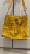 Bold yellow shoulder bag with gold studs. Features gold chain strap and signature logo charm. Ideal for a statement look.