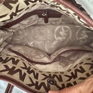 Elegant tan brown satchel with iconic MK logo. Features rich brown leather accents with silver chain lock key details. Ideal for daily elegance. Excellent like new used condition.