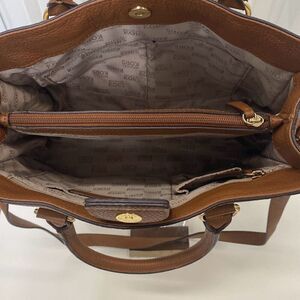 Michael Kors Hamilton satchel bag. The color is gold and tan has a cross Brody strap.  in good preowned condition. This bag is in very good condition. Has a zipper pocket on the inside a slit pocket for your phone and a middle pocket with the zipper. See pictures for more details.