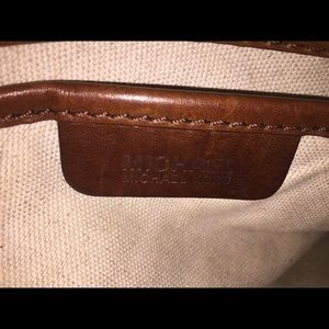 MK signature jacquard fabric with leather trim. Gold tone hardware. Hardware feet on bottom. 1 slip pocket on back. Inside 1 zip pocket, 3 slip pockets, 1 cell phone pocket. Fully lined with fabric. 13” (L) x 9” (W) x 8.5” (H). Extra Shoulder strap is not included. Good condition. Interior fabric is slightly stained
