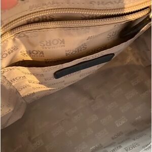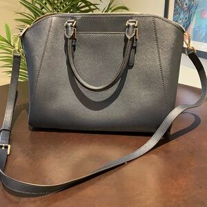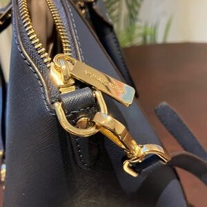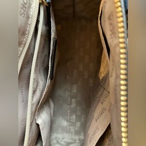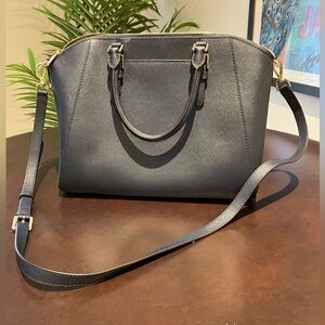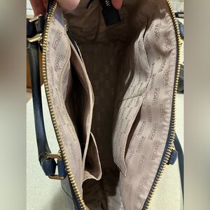 This zip top satchel is NWOT and in perfect condition with two structured handles, and gold tone hardware. Bag is lined in signature designer logo and has five interior pockets with one zip up compartment and bonus exterior pocket. Exterior measurements are 13 inches wide x 10.5 inches high x 6 inches deep and comes with a removable, adjustable strap (19 inch drop), but no dust bag.