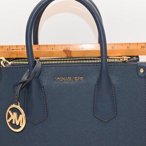 Dark Blue Michael Kors handbag. It can be carried by the hand strap or worn as a cross-body. It has a hard body with a zipped middle compartment. In good condition, just smaller than I wanted and I need the space in my closet!