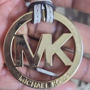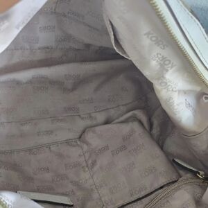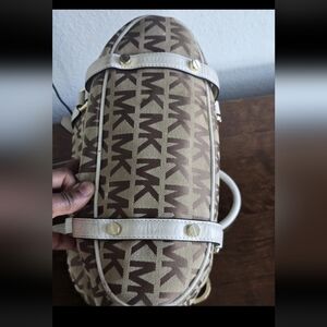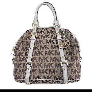 This Michael Kors satchel showcases a timeless brown and cream color palette with the iconic MK monogram pattern. Its structured design and domed shape make it a stylish choice for everyday use, while the cream leather trim adds a touch of elegance.