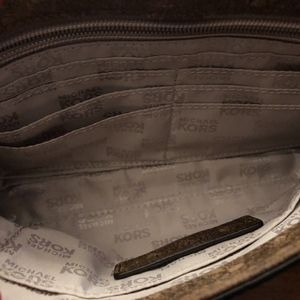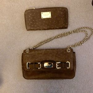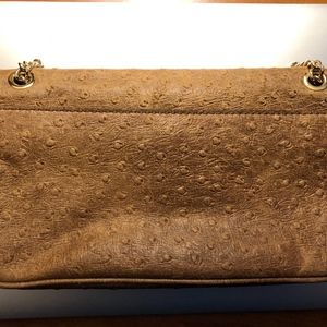 Handbag with chain handle, snap closure, organizer and 2 pockets with 1 zippered , snap closure on back. 11" x 6" x 2" depth.