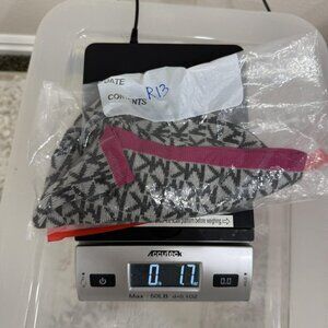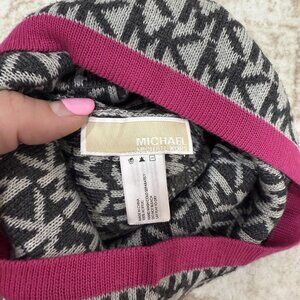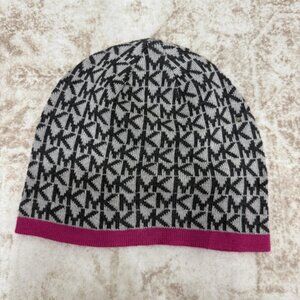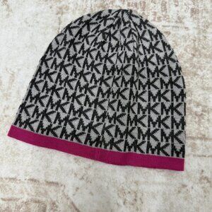 Michael Kors Hat Beanie Womens One Size Gray Black MK Logo Print Pink Trim Knit