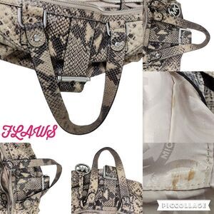Brand: Michael Michael Kors. Occasion: Casual. Any. Material: OUTER: Python Snake print leather. INTERIOR LINING: Nylon lining. Style: Heidi Dark Sans Satchel. Color: Tan. Brown. Black. Silver. Pattern: Snake print. Animal print. Python print. Features: Two flat leather handles connected by silver labeled connectors. Silver-tone hardware. Full top zipper. Color: Beige. Tan. Brown. Black. Silver. Hardware: Silver tone. 5 interior pockets. Adjustable buckles on both sides and on both ends. Leather zipper pull with silver MK embossed-end hardware. Michael Kors Signature Silver Charm. Four protective feet on the bottom. Spacious interior with printed Signature lining. MK tag and a leather strip. Inner strip with clasp for keys. Certificate of Authenticity included.