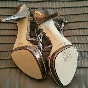 4.5" heel/ 1" platform; Metallic/ Nickel Embossed- Leather Platform Sandal. Only worn around the apartment once just trying on when I first bought them! Injured my ankle so will never wear. Never worn outside.