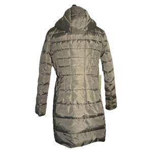 The Michael Kors Hooded Full Length Packable Quilted Double Zip Puffer Coat in size Small is a stylish and practical outerwear option for women. Made with durable nylon outer shell material and insulated with down, this long puffer jacket is perfect for colder seasons like winter, fall, and spring. The olive green color and quilted accents add a touch of sophistication to the coat, while the hooded design and zip closure provide extra warmth and convenience. Care for this jacket by dry cleaning only to maintain its quality.