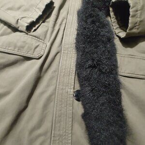 This olive hooded parka offers practical warmth with a faux fur trim and sherpa lining. Designed for functionality and style, it features multiple pockets and durable construction.