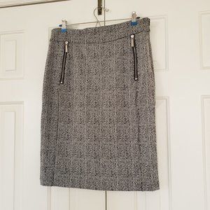 Sleek and sophisticated! Excellent pencil skirt from Michael Kors. Black & white small houndstooth pattern on knit stretchy fabric. This skirt will accentuate your curves! Side zip with front zipper details. Back slit can be opened or left closed. Perfect for the office!