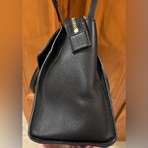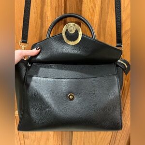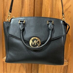 Hudson satchel by Michael Kors. Features gold-tone logo and hardware. Natural pebble leather with detachable shoulder/crossbody strap. Perfect for stylish outings.