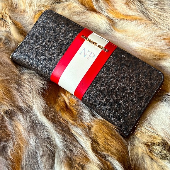 Vegan leather zip-around wallet by Michael Kors. The initials on front could be easily covered with leather paint. Selling because I want to switch up my purse accessories!
