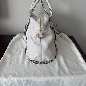 Michael Kors Ivory Pebbled Leather Top Handle Zipper Closure Satchel Bag with Cross Body Strap 100% authentic In pre-owned condition Features: * Material: leather * Size: medium * Measurements (L x H x W): 14”x 12”x 7”* Gold-tone hardware * Zip-top closure * Fabric lining inside * 1 Inside zipper pocket and 4 additional open pockets * Leather handles with 6’ drop Exterior: good condition, it has some minor scuffs on the surface as signs of normal wear. See photos attached. The handles are in good condition with one or 2 scuffs. Outside pocket magnet is in perfect condition. Cross body strap in perfect condition. Both zippers work well. The hardware is in perfect condition. Interior: clean, minimal surface wear, no tears or rips.