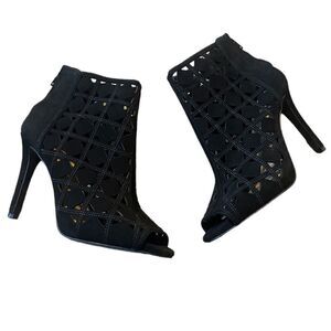 Michael Kors caged geometric black suede leather heels booties. Black laser cut suede leather upper. 4" heels. Exposed silver tone back zip. Lightly padded insole. Stiletto heel style. Peep Toe.