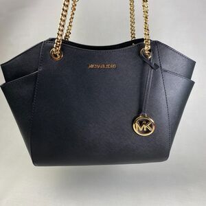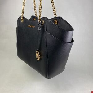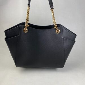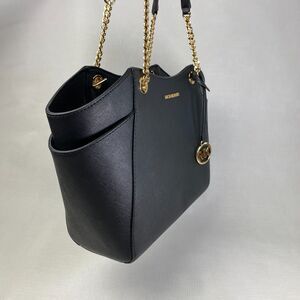 Michael Kors JET SET Large Black LEATHER TOTE BAG! MK SHOULDER Travel Gold Chain