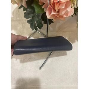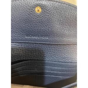 Genuine leather blue leather wallet. Flap close with gold tone hardware.