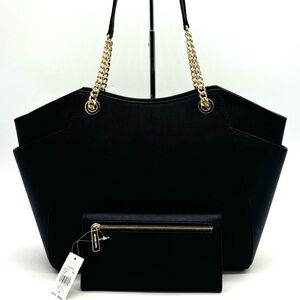 Michael Kors JST Large Chain Shoulder Tote Bag & Trifold Wallet Black/Gold