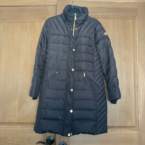 Black michale kors jacket. Gold hardware. Mid length. Has some spots on it pictured. Okay condition for the wear it got. Smoke free home