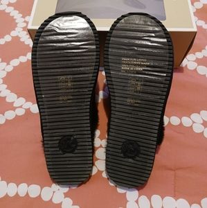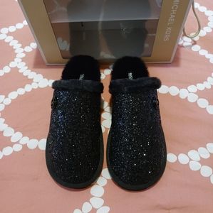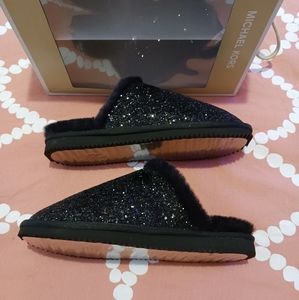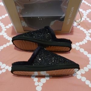 Brand new Michael Kors Janis Slipper , lined with plush faux fur, slip on design with closed rounded toe and open back for easy on and off, metal logo hardware at vamp, slip on construction, synthetic faux fur lining, Padded insole and rubber out-sole. COLOR- BLACK!! REASONABLE OFFER ACCEPTED!!