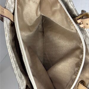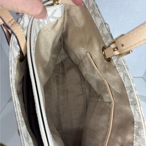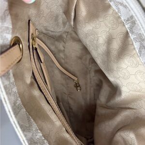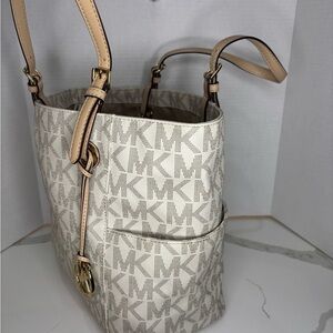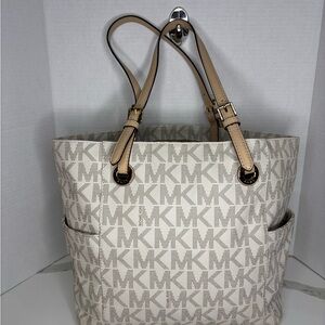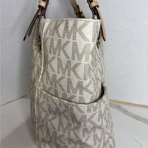 Chic Michael Kors Jet Set tote with signature MK pattern. Features dual handles and side pockets. Ideal for everyday use.