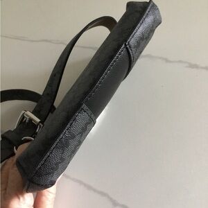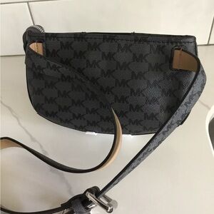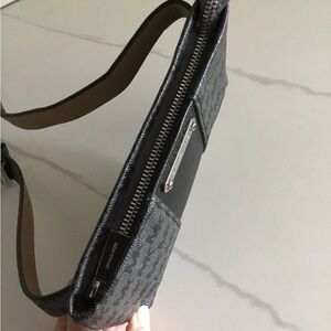 The perfect accessory for any occasion. Size L/XL with a sleek black exterior made of coated leather and a silver MK signature logo, this bag is both stylish and functional. It features an adjustable strap, leaving you comfortably hands free on your everyday outing. Top closure on bag.