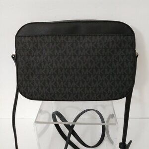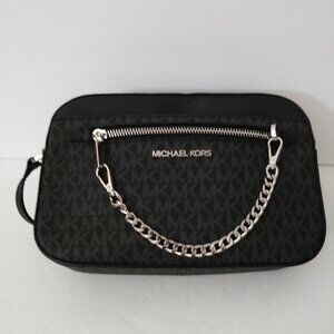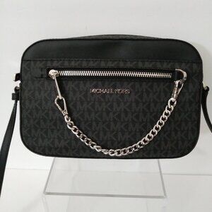 Michael Kors Jet Set Black Large Cross-body Bag • Cross-body bag, color: black, logo print canvas • 89.4% coated canvas/9.6% polyester/1% polyurethane • Silver-tone hardware • 9.5”W X 6.5”H X 2”D • Exterior details: Cross-body strap, 22” drop, back slip pocket, front slip and zip pockets. A polished chain-link zipper pull delivers standout style. • Interior details: back and front slip pockets • Lining: 100% polyester • Zip fastening Wear it while commuting, running errands or taking a weekend getaway.
